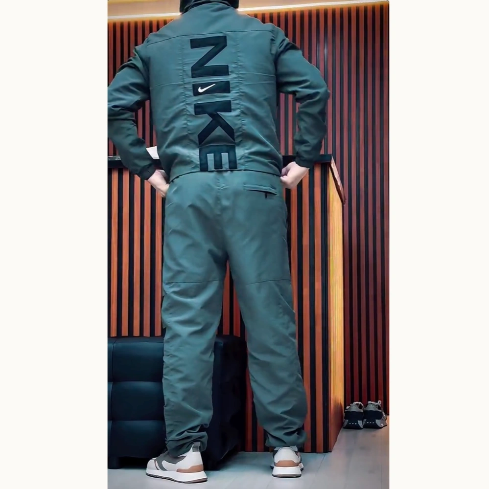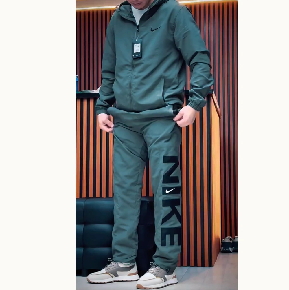 Elevate your style and comfort with this Nike tracksuit. Featuring a modern dark green hue, this set offers a lightweight jacket with a convenient hood and spacious pockets, perfect for on-the-go or casual wear. The matching pants boast a bold, oversized Nike logo down the leg, making a statement wherever you go. Crafted for both performance and fashion, this tracksuit is your new go-to for active days and relaxed weekends. Experience the iconic Nike quality and design.